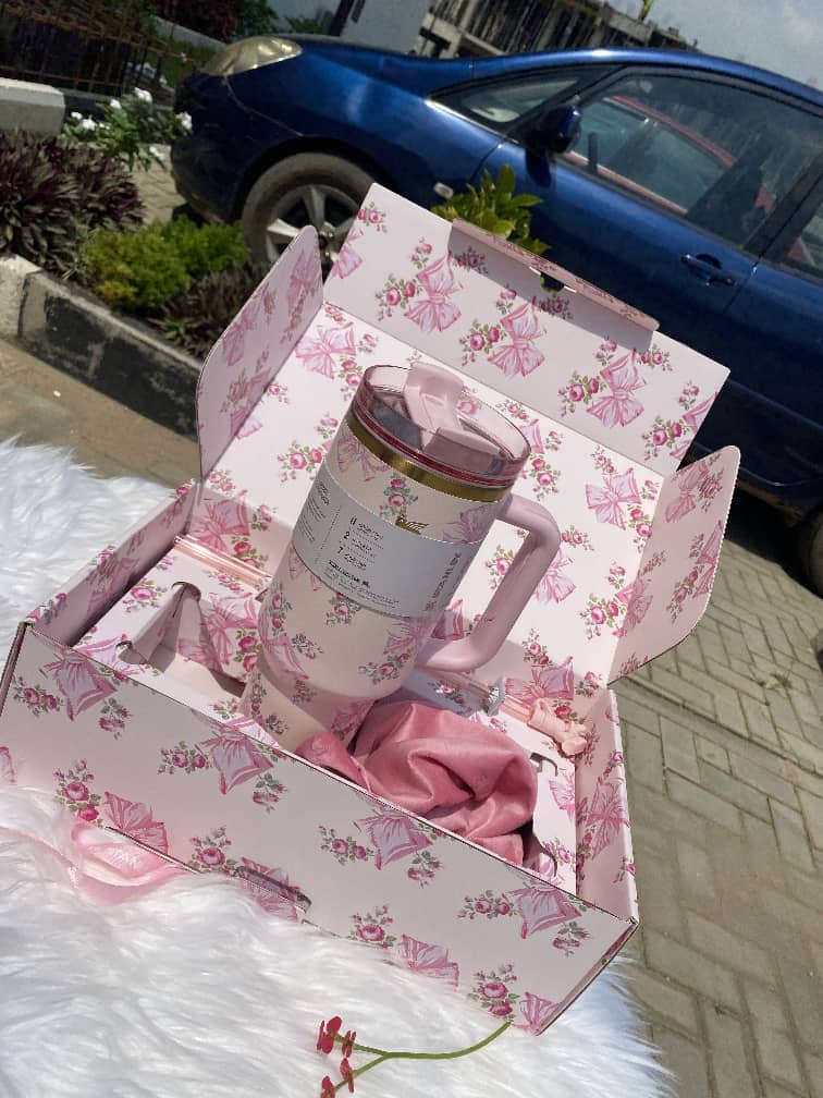 The product is a 40 oz, double-wall, stainless steel, vacuum-insulated tumbler with a handle and straw.