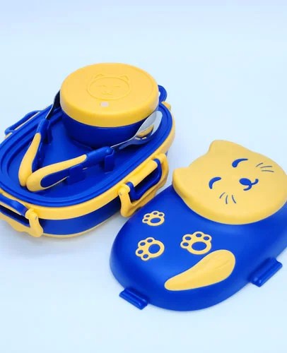 It includes a multi-compartment lunch box and a set of cutlery (spoon and fork).